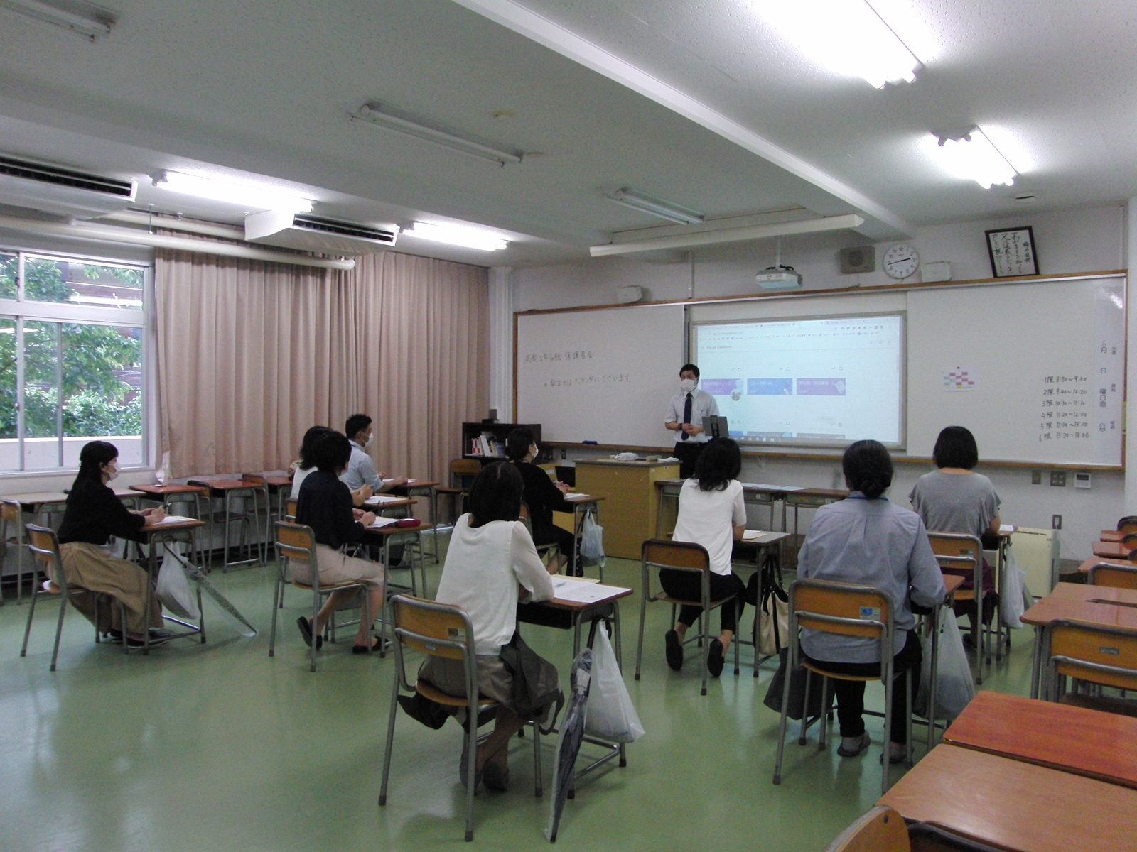 雨で足元が大変悪い中、たくさんの方にお集まりいただきました。 新学期が始まって二か月が経ち、初めて担任と保護者の方々との対面がかないました。