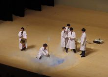 中高科学部が液体窒素を使った実験を行い、会場に驚きの声が上がりました。